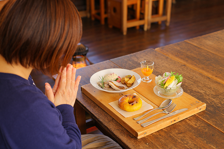 静かな森の中に佇むカフェでは、村の自然をさらに身近に感じるひとときを。敷地内で平飼いされている鶏の卵を使ったカルボナーラや、自家製生地のピザが人気です。開放的なオープンテラス席ではペット同伴も可。