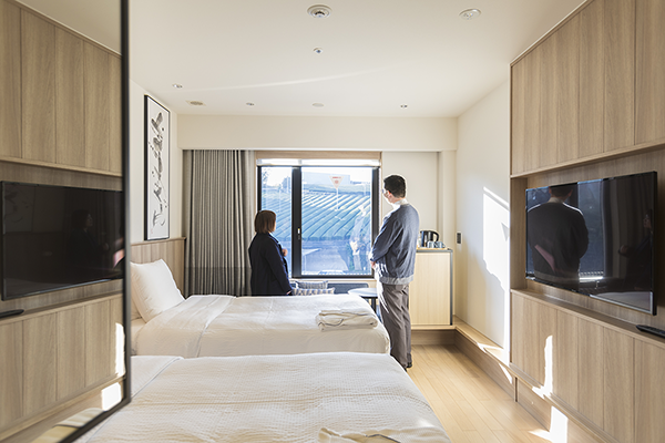 道の駅に隣接するホテル。客室はシンプルながら洗練された設えで、スタンダードなツインベッドルームなどのほか、愛犬と一緒に泊まれる「ドッグフレンドリールーム」などユニークなタイプも展開。窓から茶畑が望める「茶畑ビュー」のお部屋がおすすめです。
