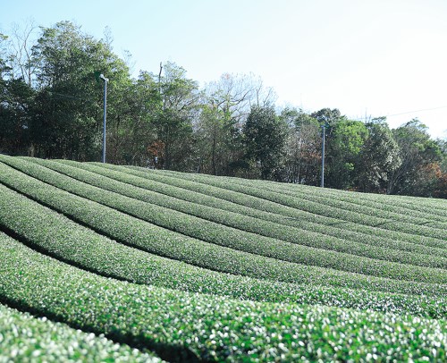 日本茶800年の歴史を支えてきた、宇治茶の主産地である南山城村。特に日本茶のトップブランドである「宇治茶」のうち、京都府内生産量の約2割を生産しています。村域の約4分の3が山林で占められ、平地が少ない南山城村では、その独特な地形を利用して、茶園は急峻な山間部や起伏に富んだ丘陵につくられています。寒暖差のある気候や木津川の川霧、土壌条件も茶葉の栽培に適していることから、薫り高く良質な高級茶が日々育まれているのです。